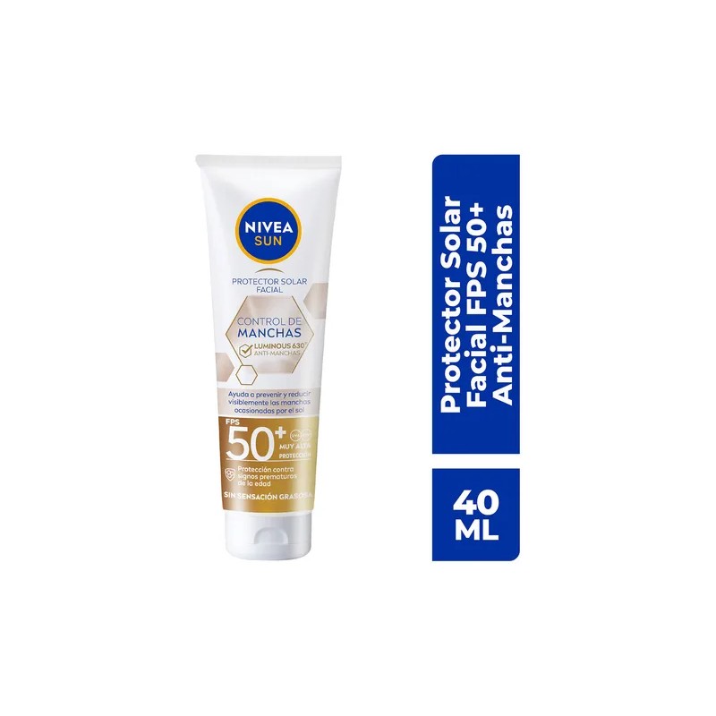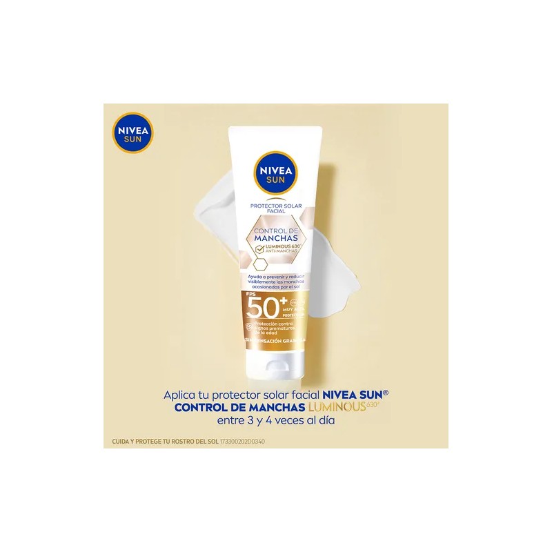 El protector solar facial NIVEA SUN Control de Manchas Luminous 630 ayuda a prevenir y reducir visiblemente las manchas ocasionadas por el sol, mientras protege tu rostro contra los rayos UVA/UVB. Proporciona una protección solar inmediata y eficaz FPS 50+ contra los rayos UVA/UVB. Su fórmula hidratante tiene una sensación refrescante y sin sensación grasosa que ayuda a prevenir los signos prematuros de la edad y reducir manchas gracias al ingrediente activo Luminous 630, con resultados visibles en 4 semanas. Aprobada dermatológicamente.