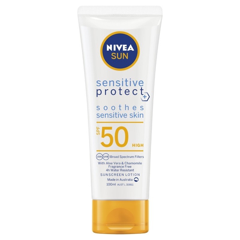 NIVEA SUN Sensitive Protect Sunscreen Lotion SPF50 cares for your skin in more ways than one, combining broad spectrum sun protection whilst being suitable for sensitive skin. Highly effective UVA and UVB filters shield skin from sun damage. The non-greasy formula helps to soothe and calm reactive skin, made with quality ingredients such as Aloe Vera and Chamomile. Plus, the fragrance free formula with moisturising Vitamin E helps protect and repair the skin by keeping it hydrated resulting in it being less vulnerable to sun damage. The skin compatibility of this sunscreen has been dermatologically tested and approved. Made in Australia.