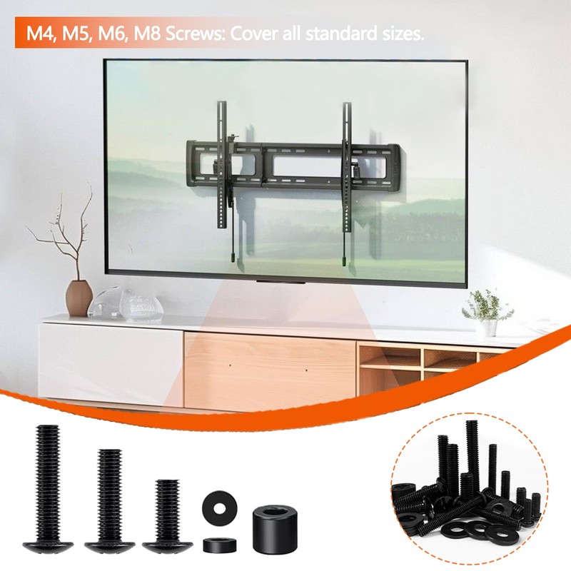 - Each set of screws (M4,M5,M6 and M8 screw) is manufactured from high-strength iron with durable electroplating, meeting rigorous quality standards. Paired with spacers and ABS plastic tubes, these screws reliably secure TVs up to 80 inches, compatible with basic brackets and advanced mounting systems.