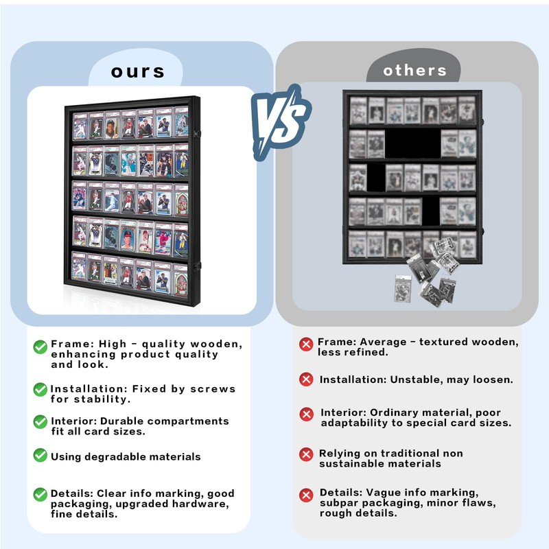 Crafted with precision from premium wood, the sleek, scratch-resistant exterior exudes luxury while ensuring long-lasting durability. The crystal - clear acrylic panel (used instead of glass) offers outstanding transparency, just like a clear window, making every fine detail of your cards stand out. Your collection is safeguarded by advanced UV - blocking technology,guarding against fading and sun damage to preserve vibrant colors and value for years.
