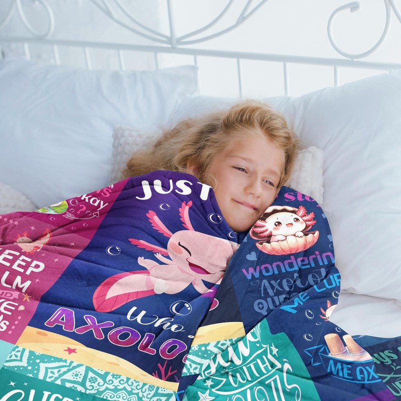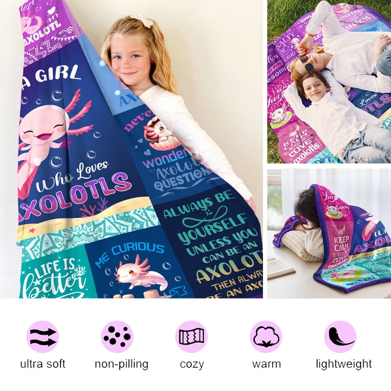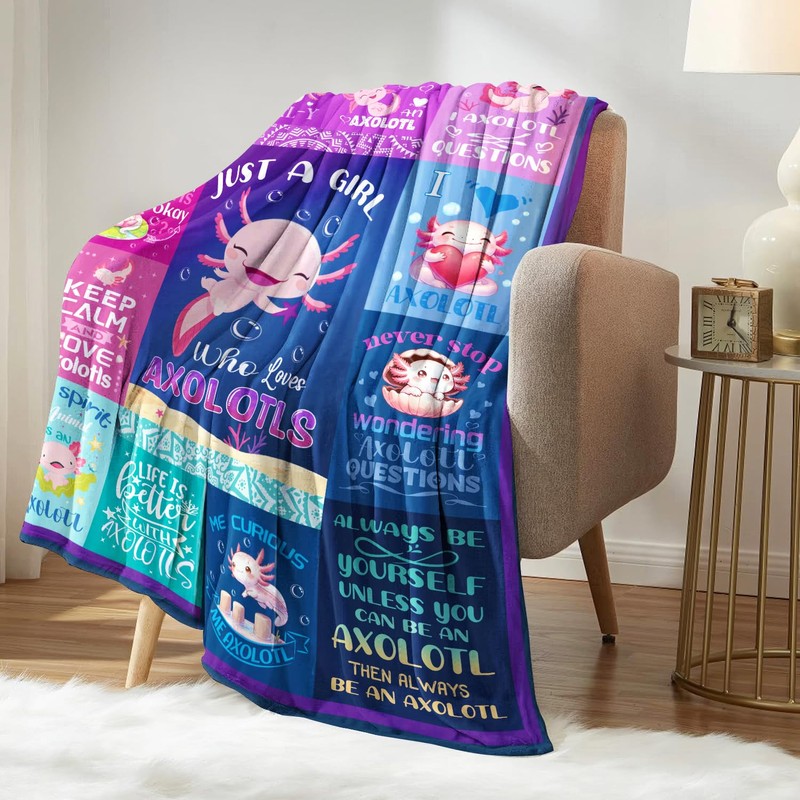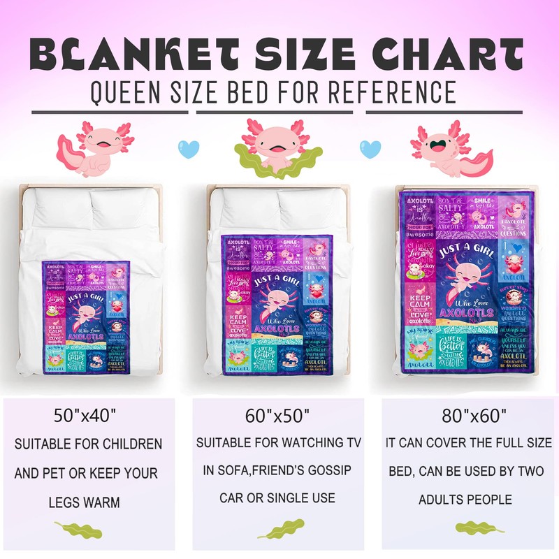 - Axolotl Gifts For Girls: The cute axolotl design is fashionable and eye-catching, making it the perfect gift for a girl who loves axolotls, with its creative image print as stunning highlights. Just a girl who loves axolotls, this axolotl blanket gift is not only to bring warmth, but to bring love. You can send this blanket for those who like axolotl.