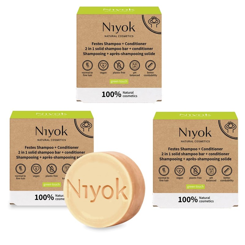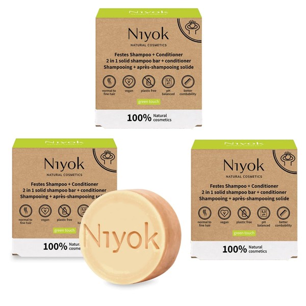 Niyok Natural Cosmetics 2-in-1 Solid Shampoo + Conditioner Bar, Green Touch Scent, 80g, 3-Pack