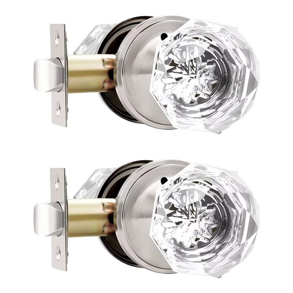 NIZADO 2 Pcs Crystal Privacy Door Knobs Interior, Satin Nickel Glass Door Knobs with Lock, Diamond Door Knobs for Bedroom Bathroom