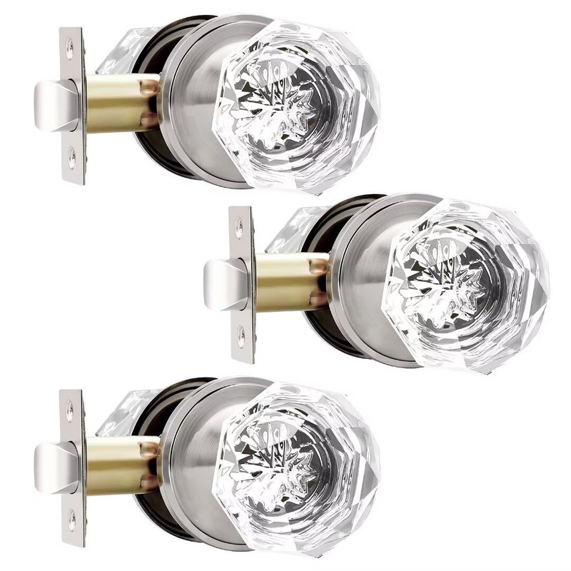 NIZADO Interior Glass Door Knobs 3 Pack, Crystal Door Knobs Satin Nickel, Chrome Diamond Passage Door Knobs for Closet