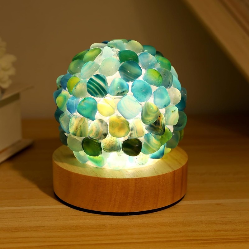 Nizrsky Blue Agate Lamp,Healing Crystals Night Light with Wooden Baseor for Yoga Balance, Reiki Healing, Meditation,Small Tiffany Ball Table Lamp for Bedroom Living Room