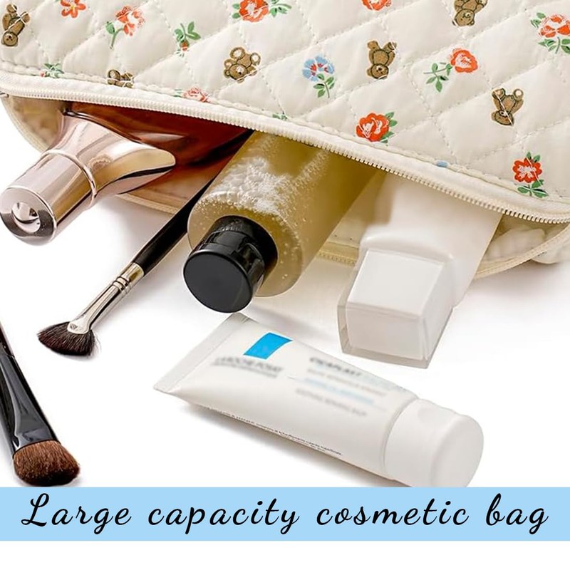 NJCXOLA White Bear Floral Pattern Quilted Cosmetic Bag Large Capacity Soft Cotton Makeup Brush Beauty Tool Bag