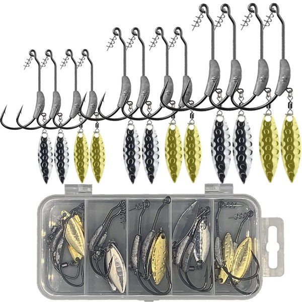 - Offset hooks with lead: the fishing hook set contains 12 weighted offset hooks in three weights (2g 3g 5g). Two hooks each with golden and silver spinner blade of each weight class. Target fish: zander, pike, perch, asp, chub, trout