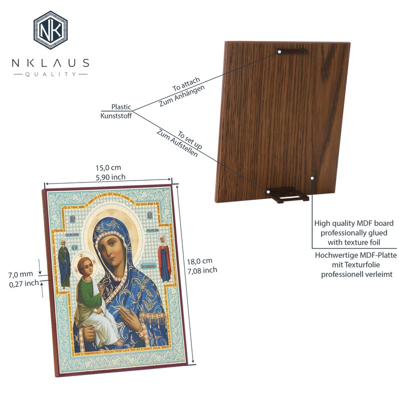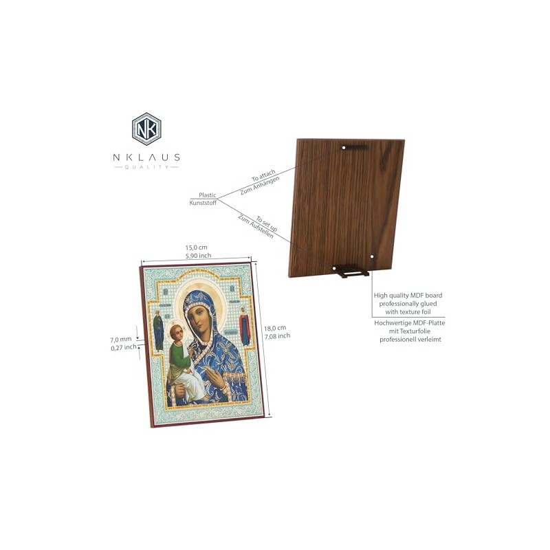 Gefertigt aus hochwertiger MDF-Holzplatte und auf der Rückseite mit spezieller Dekorfolie veredelt, bieten unsere Ikonen eine langlebige Holzoptik. Unsere Einzelikonen verfügen über eine exklusive Halterung, die sowohl das Aufstellen als auch das Aufhängen ermöglicht. Die sorgfältig verarbeiteten Kanten sorgen für eine makellose Oberfläche, die oft mit Kunststoff verwechselt wird – doch es ist echtes MDF-Holz. Stabile Kunststoffscharniere ermöglichen eine flexible Nutzung unserer Klappikonen.