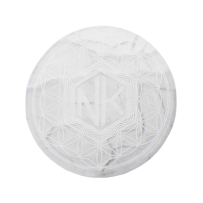 NKlaus Selenit Aufladeplatte Ø12cm – Lebensblume Gravur, energetische Unterlage für Kristalle, Heilsteine & Schmuck, spirituelle Reinigung