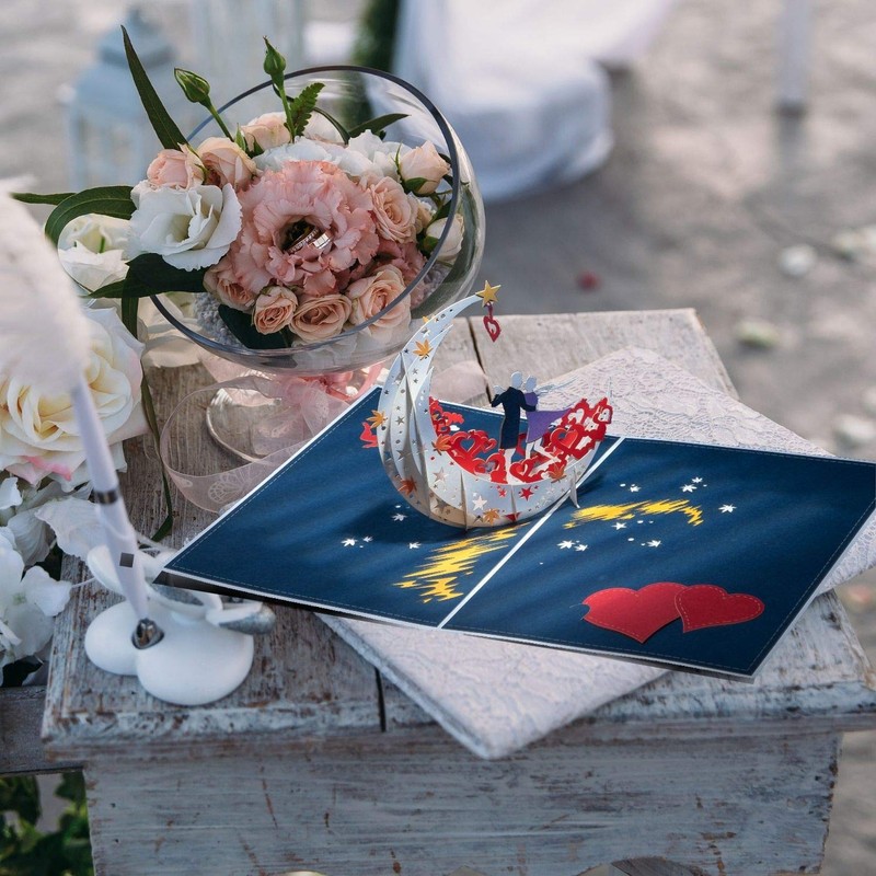 - 【Thoughtfull Conception】The principal part of the lovers and moon boat will pop up immediately when opening the card. And a warm trick: One of the red heart inside is moveable & openable. You can hide some secret words there to see if she/he can find it. All the elaborate designs show your concern of the comming sweet moment.