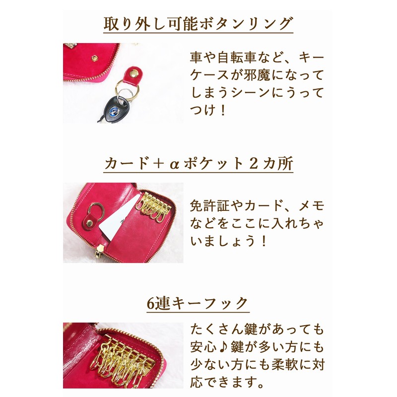 - 【仕様】ラウンドファスナータイプ。キーフック6連、取り外し可能なキーリング、カードポケット2カ所。