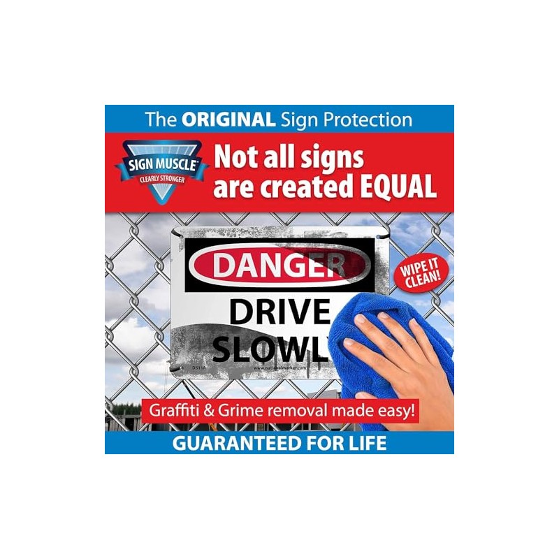 - Features Sign Muscle protective liquid laminate. Protects against the UV rays, chemical resistant, graffiti resistant. Extends the life of the product.