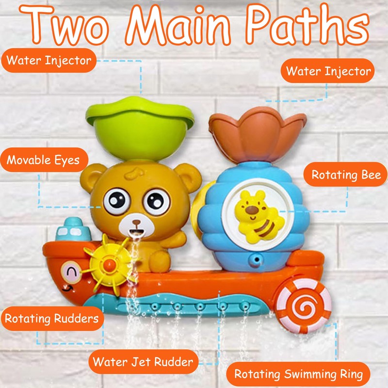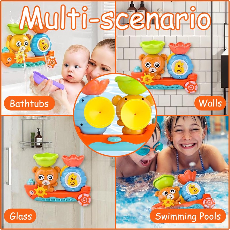 - Creative design – immerse yourself in the world of bathing fun with our bath toy set. When the children pour water into the upper part of the fountain, water comes from the mouth of the bear, from the bottom of the bee and from the side of the wheelbarrow. Bath toy from 2 years for children, the vibrant colours stimulate the imagination and make bath time a fun adventure.