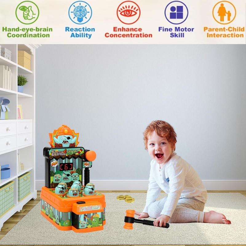 - Classic arcade experience, exclusive interactive fun for children aged 3 and up. Child-friendly hammer game according to the popular Whack-A-Mole principle: the "Zombie War" toy is a mini arcade machine with 2 light hammers, which inspires children from 3 years on, hit the hammers on the colourful painted wooden stakes - if one Next on! A perfect game for the whole family to have fun together and stimulate children's imagination