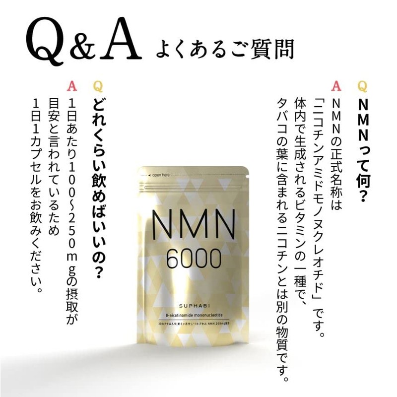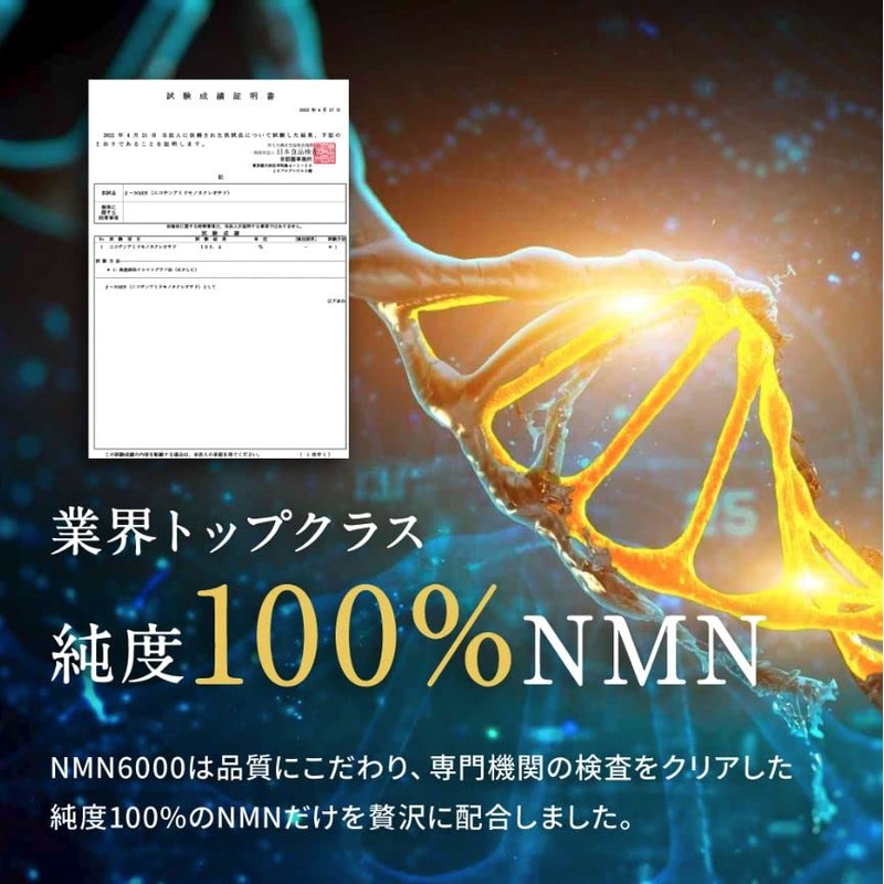- ✅NMN6000は品質にこだわり、専門機関の検査をクリアした純度100%のNMNだけを贅沢に配合しました。