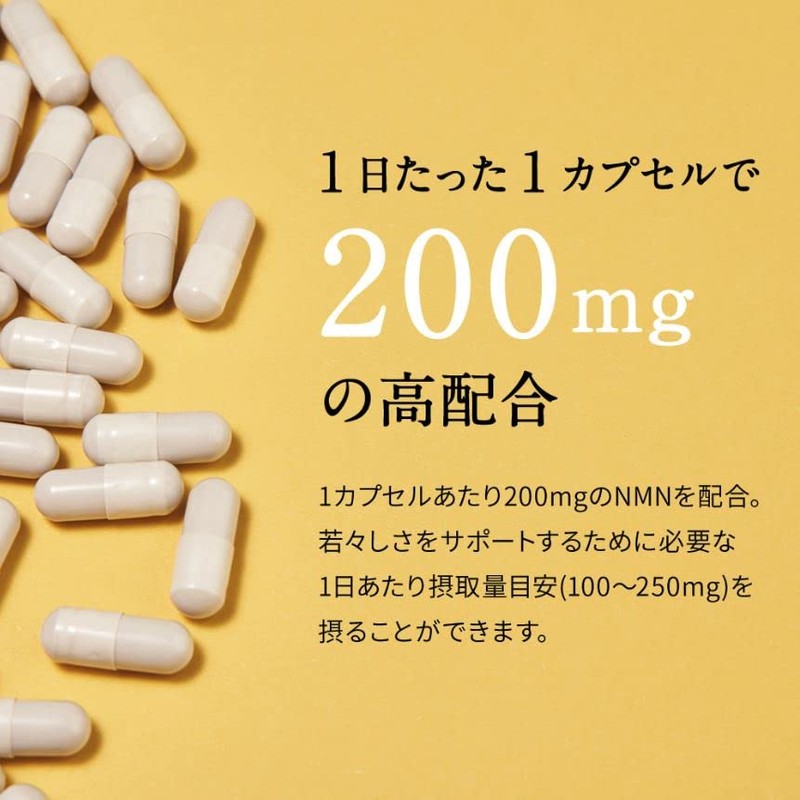 - ✅【1袋NMN含有量6000mg】【1カプセルあたり200mg】のNMNを配合。若々しさをサポートする為に必要な1日あたり摂取量目安(100~250㎎)を摂ることができます。