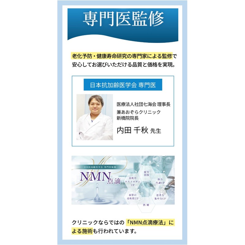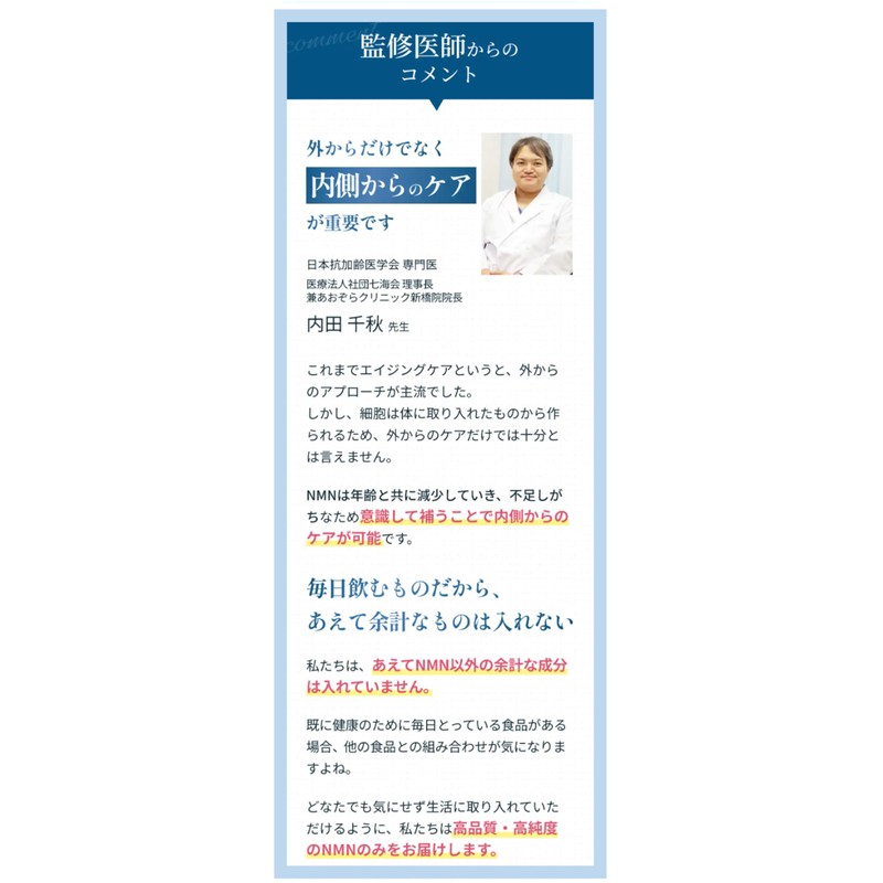 - 監修医師より 【NMN BENTEN 3000】は、あえて余計なものはいれず品質と価格にこだわりました。本物を求める方にお喜びいただけると思います。