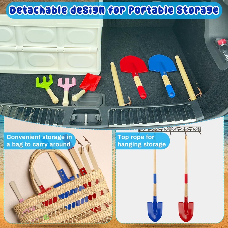 - Detachable design & easy storage: The 2pcs long shovels feature a detachable wooden handle that allows for two sizes: 15.3in and 27in, convenient for you to choose the size according to the different heights of your kids. Each long shovel has a rope loop at the top that allows it to be stored hanging vertically, removable makes it easy to tuck in a shed or garage, ready for the next beach adventure(Note:3pcs beach spades with a fork, rake, flat shovel is non-removable)