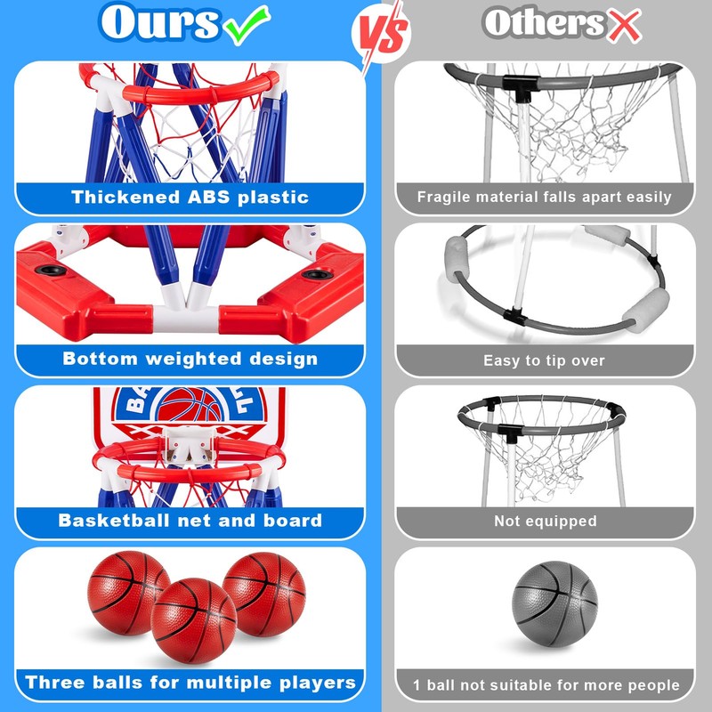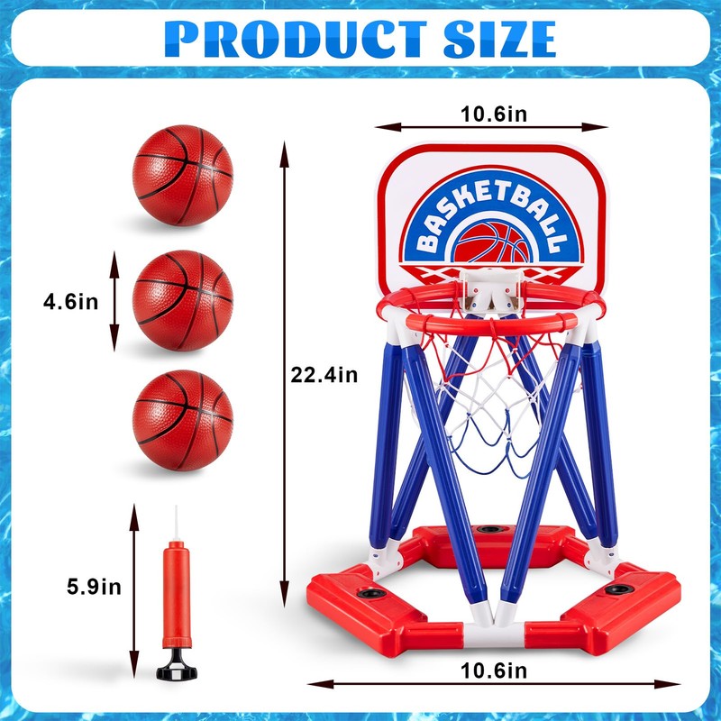 - Pool basketball hoop set: Each set includes 1 basketball hoop, 3 basketballs, 1 pump, 1 instruction manual, and color box packaging. The color box packaging is convenient for storage and suitable as a present for friends and family