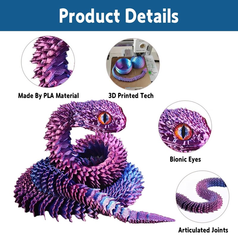 • 3D Printing with Realistic Detailing: Enjoy the intricate details and lifelike appearance of this 3D printed snake, carefully crafted for maximum realism. Made using premium materials, this snake fidget toy captures the beauty of real reptiles, making it both a captivating decor item and a functional stress relief toy.