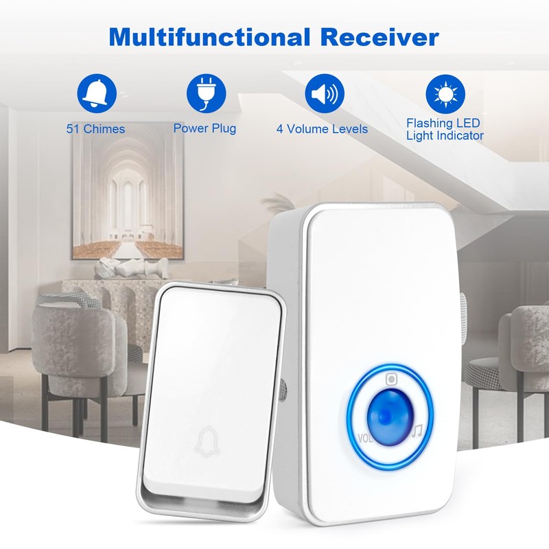 - 【MULTIFUNCTIONAL RECEIVERS】: 51 chimes, 4 volume levels, power plug, flashing LED light indicator will be light up automatically in dark(can‘t be shut off)