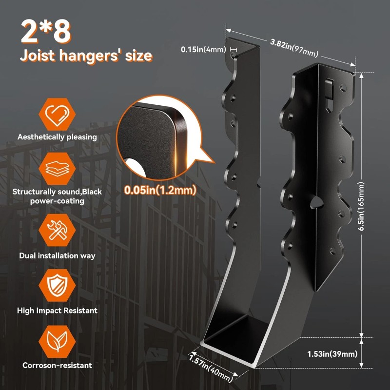 - AMAZING DESIGN:The black 2X8 joist hanger black can be used for floor deck or Ceiling Trusses, or connect to rafters, on roof beams were held securely in place and make them as sturdy as possible to withstand the force of high winds/earthquakes or allowing you to store belongings with peace of mind.