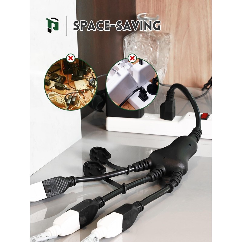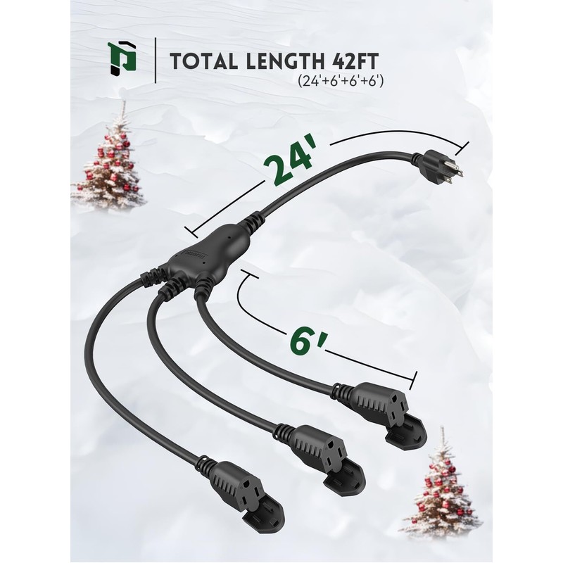 - 🎄【1 to 3 Cord Splitter】There is 1 main cord that splits into 3 other extensions, the main cord length is 24 ft and then it splits into three cords each 6 feet long. Total length is 42ft (24'+6'+6'+6').