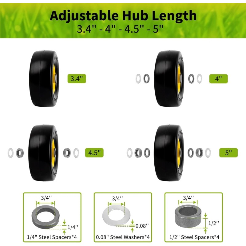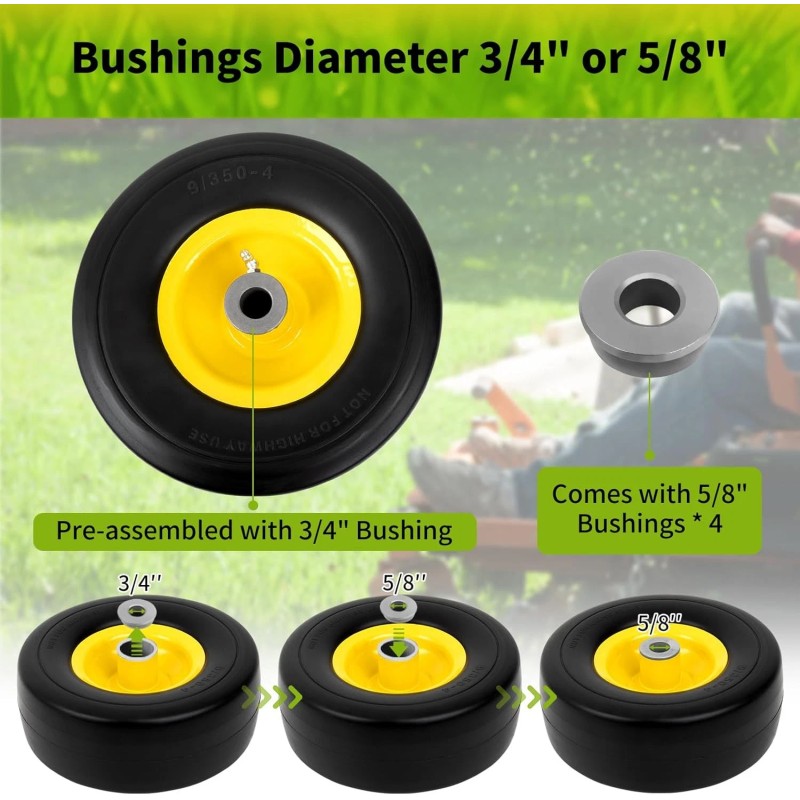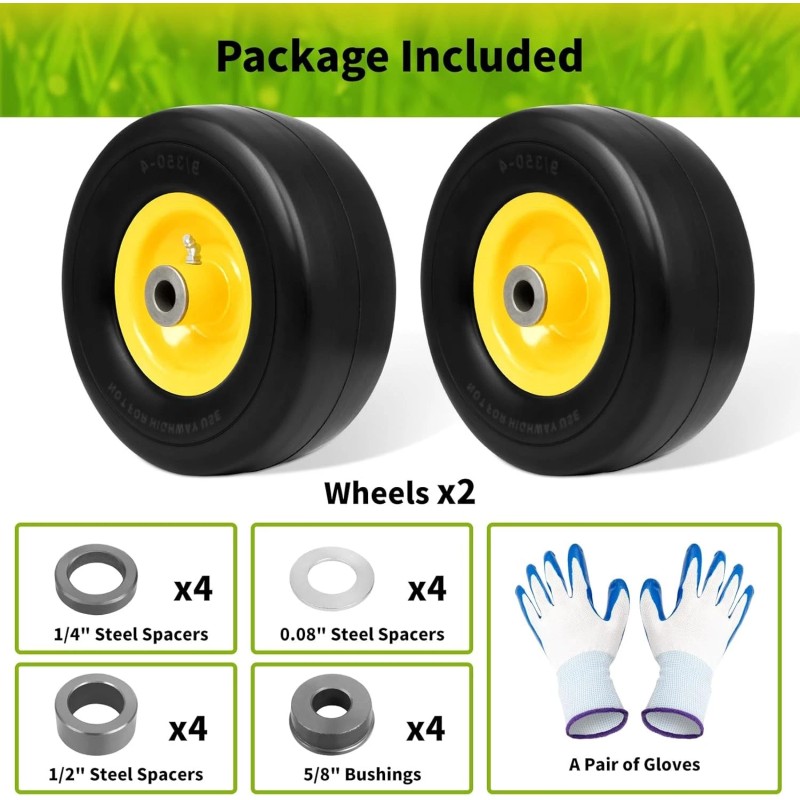 - 【Package Included】9x3.50-4" Wheels x 2, 1/2" Steel Spacers x 4, 1/4" Steel Spacers x 4, 0.08" Steel Washers x 4, 5/8" Bushings x 4, A Pair of Gloves (Warmly caring for your hands.)