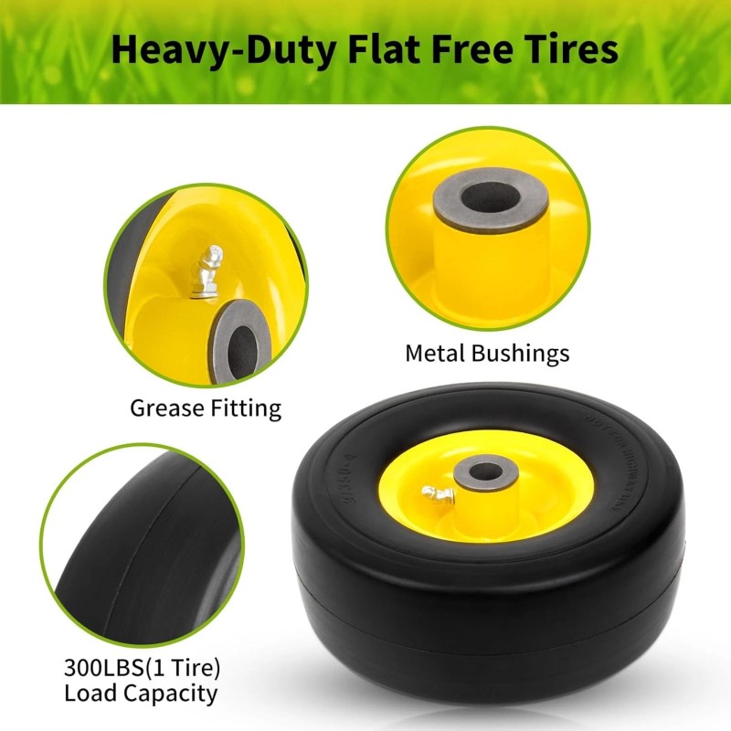 - 【Enhanced Durability】Made of solid polyurethane foam, offer a maintenance-free, puncture-proof solution for your mowing needs. Despite being flat-free, they mimic pneumatic tires in load characteristics, providing bounce without puncture risks. With a max load of 300 lbs/1 tire, these robust tires are ideal for heavy-duty use. (NOT for highway and static load-bearing use.)
