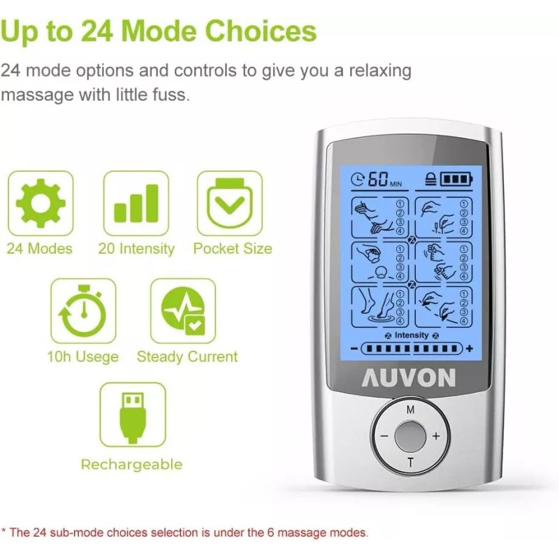 • Upgrade 24 Choices for Pain Relief: The AUVON electronic TENS device has as many as 24 user-friendly pre-programmed massage modes and adjustable timing, making it much easier to use than other traditional electric therapy products, which may require you to set the pulse frequency and duration of each pulse manually (the 24 sub-mode choices are under the 6 massage modes)