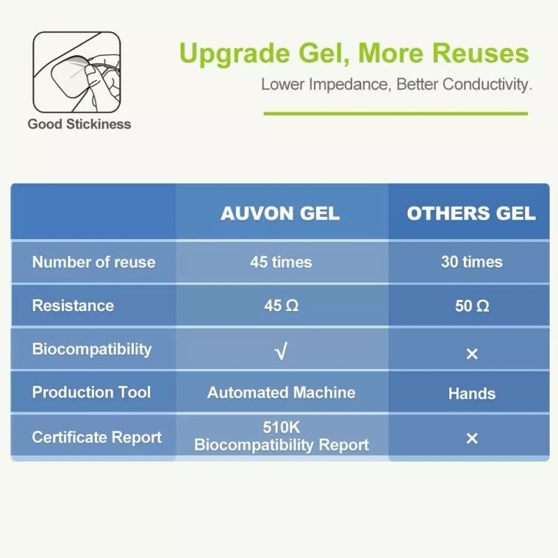 • TENS Pads with Upgrade Gel: The low-impedance solid gel has been upgraded to the industry-leading adhesive, which can provide premium self-stick performance and easy clean-up after 45 uses for a longer lifespan. You may also find it quite easy to find compatible electrodes (2mm pigtail TENS Unit pads) on the market for you to choose from