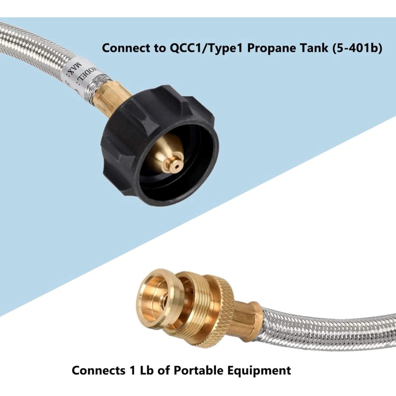 - ❤ Connect 1 pound portable appliance to 20 pound propane tank - hose with adaptor fitting let you hook your 1Lb propane required propane appliance with 20 lb tank or lager by connecting this adaptor, allows connection to more fuel