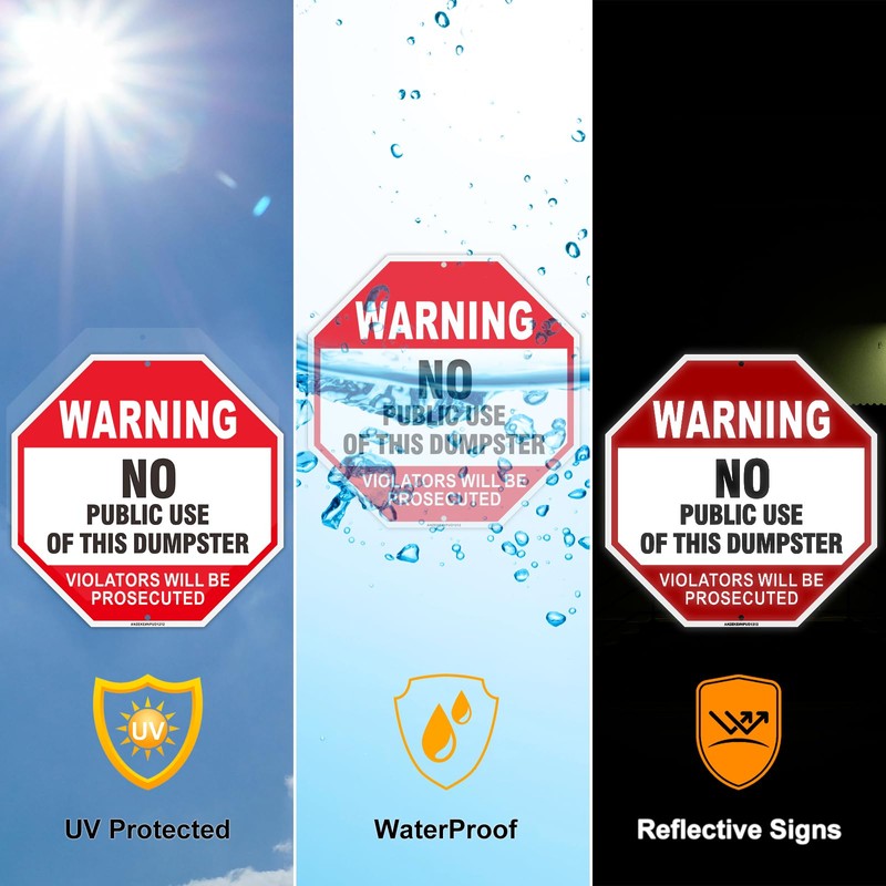 - Reflective at Night: No public Use of dumpster sign is made of high-quality reflective material. When illuminated by external light at night, it will be reflected, and the text content and graphics of the sign will be clearly visible, serve as a good warning at night.