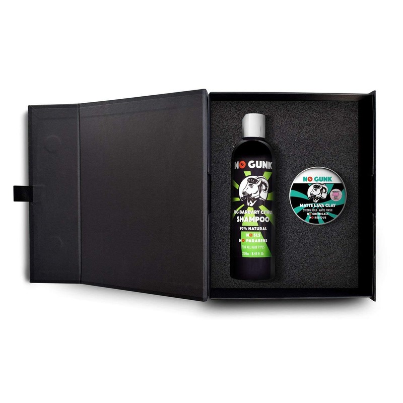 - The No Gunk matte lava clay (50 g) for strong hold and effortless, natural look.