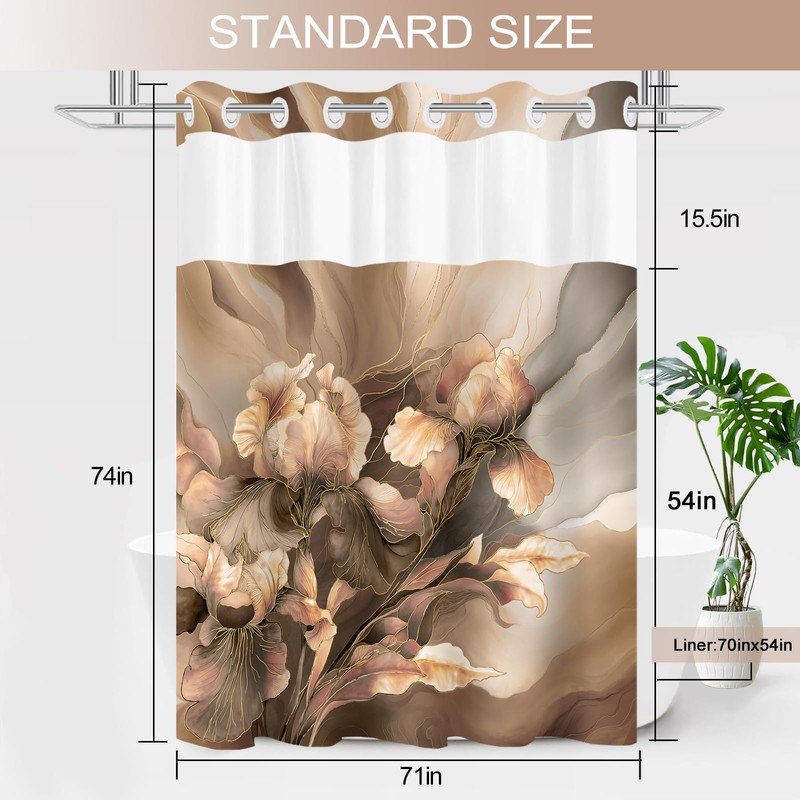 No Hook Floral Shower Curtain with Snap in Fabric Liner Set, Spring Iris Design, Elegant Abstract Marble Flower Ringless Hotel Style for Bathroom Decor, Brown 71x74 Inches