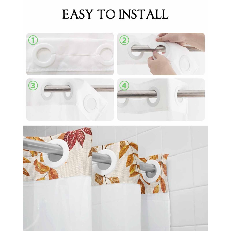 - HOOKLESS SHOWER CURTAIN: Unique "split ring" design of no hook shower curtain and liner set allows for hassle-free installation without the need for additional hooks or dismantling of the shower rod, offering convenience during cleaning or replacement. One person can easily install this bathroom curtain.