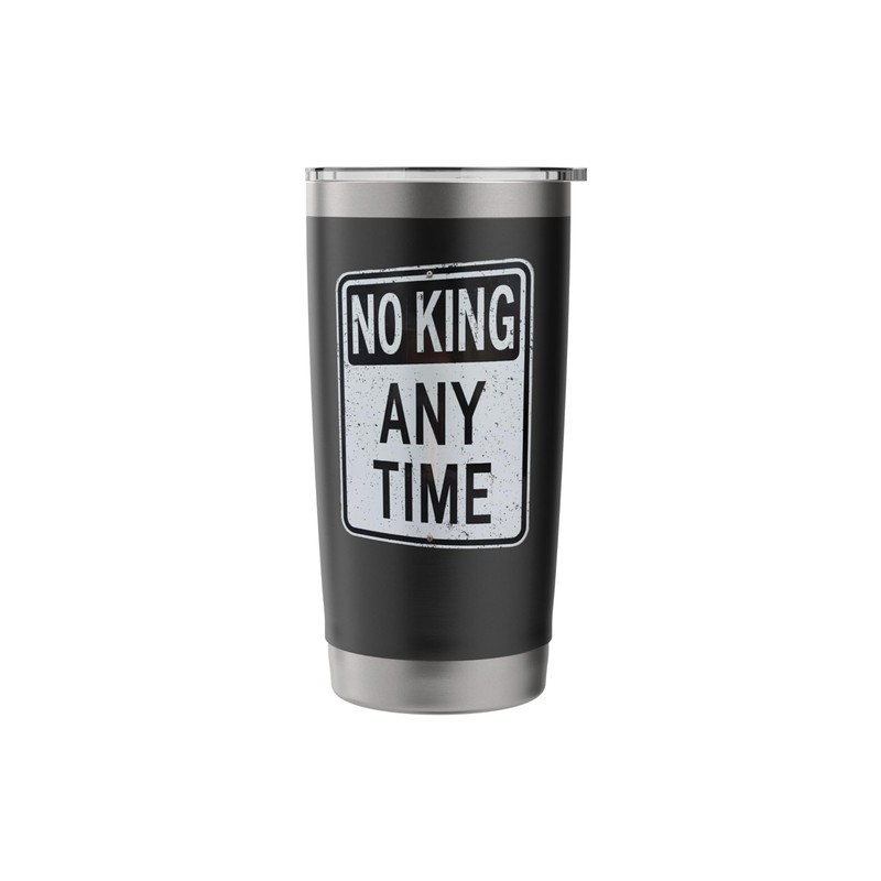 - Edgy, minimalist street sign graphic that reads “No King Any Time". Bold design for fans of anti-authority art, political commentary, and punk aesthetics. Perfect for progressive liberal men and women. No Kings In America. Anti MAGA Hands Off 2025 Protest.