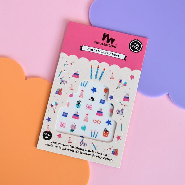 No Nasties' Birthday Themed design nail stickers are a fun and colourful way to decorate finger nails without any harsh chemicals or acetone removal! This festive pack has gorgeous designs of the Birthday Cake, party Ribbons, Balloons, Presents, Cupcakes and Stars.