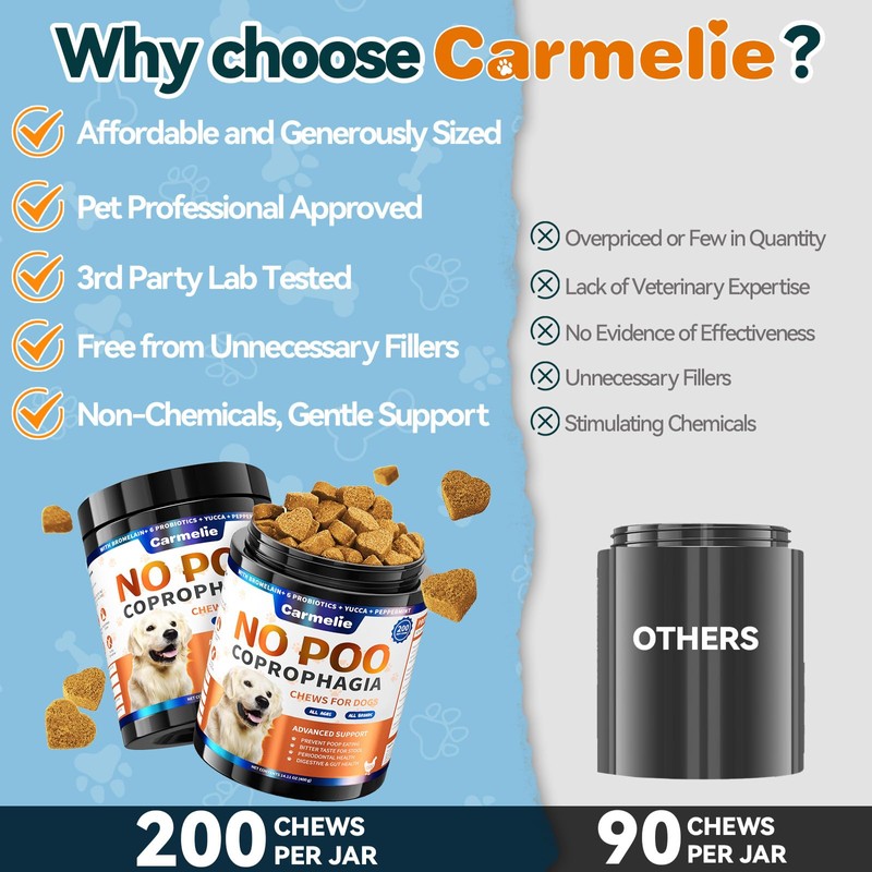 - Stop Stool Eating Naturally: Carmelie’s no poo chews for dogs help break the stool-eating habit by reducing the odor of stool, making it less appealing for your dog. Powered by a scientifically-backed formula, these no poo chews act as a natural deterrent, discouraging coprophagia and promoting better habits over time. Actual results may vary, but most pets see improvements after 2-4 weeks of regular use.