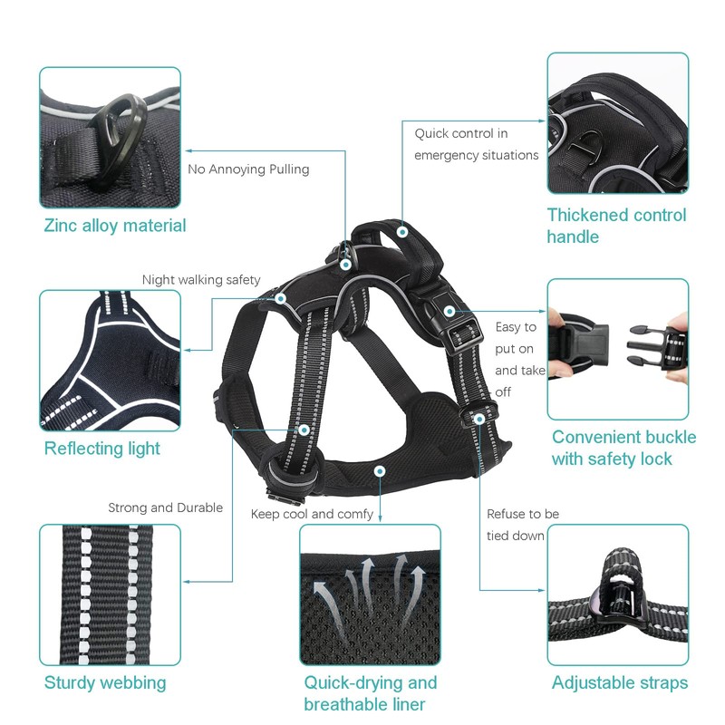 - No pull design:This dog harness is a vest style design.360°wrap which evenly distributes the pressure to protect our dog's chest and belly area and reduce annoying pulling.You can hang the leash on the back clip and wear it as a normal harness or hang it from the chest loop for anti-pull function.Also,the sturdy handle on the back helps you easily guide your dog when training, in crowds or in emergency situations.