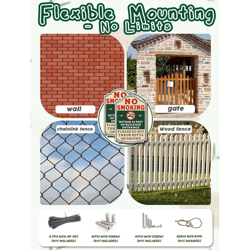 The classic green and beige color scheme with bold red "No Smoking" symbol delivers the message with both authority and aesthetic appeal. Made of 12x8 inch rust-free reflective aluminum, these signs are built to withstand sun, wind, rain, and everyday wear. Pre-drilled holes make installation easy on walls, fences, posts, or doors.