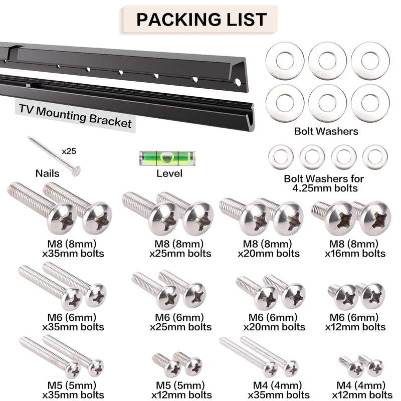 - [Fit For Various TV Sizes] Drywall TVs bar fits SAMSUNG, SONY, LG, VIZIO, TCL, ELEMENT, SCEPTRE, HISENSE and other TV brands between 32.40.43.49.50.55.65.75 Inch screen sizes accommodating the majority of TV models on the market. Drywall thickness must be greater than 0.3".