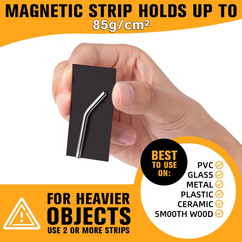 - PREMIUM MAGNETIC STRIPS: Magnet tape is made from high-quality materials with a durable magnetic surface and strong adhesive backing, which supports up to 85g/cm²and can hold even heavier items securely. The adhesive creates a lasting bond on smooth surfaces like plastic, metal, wood and ceramic.