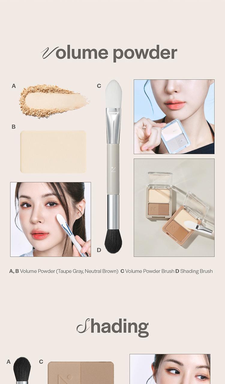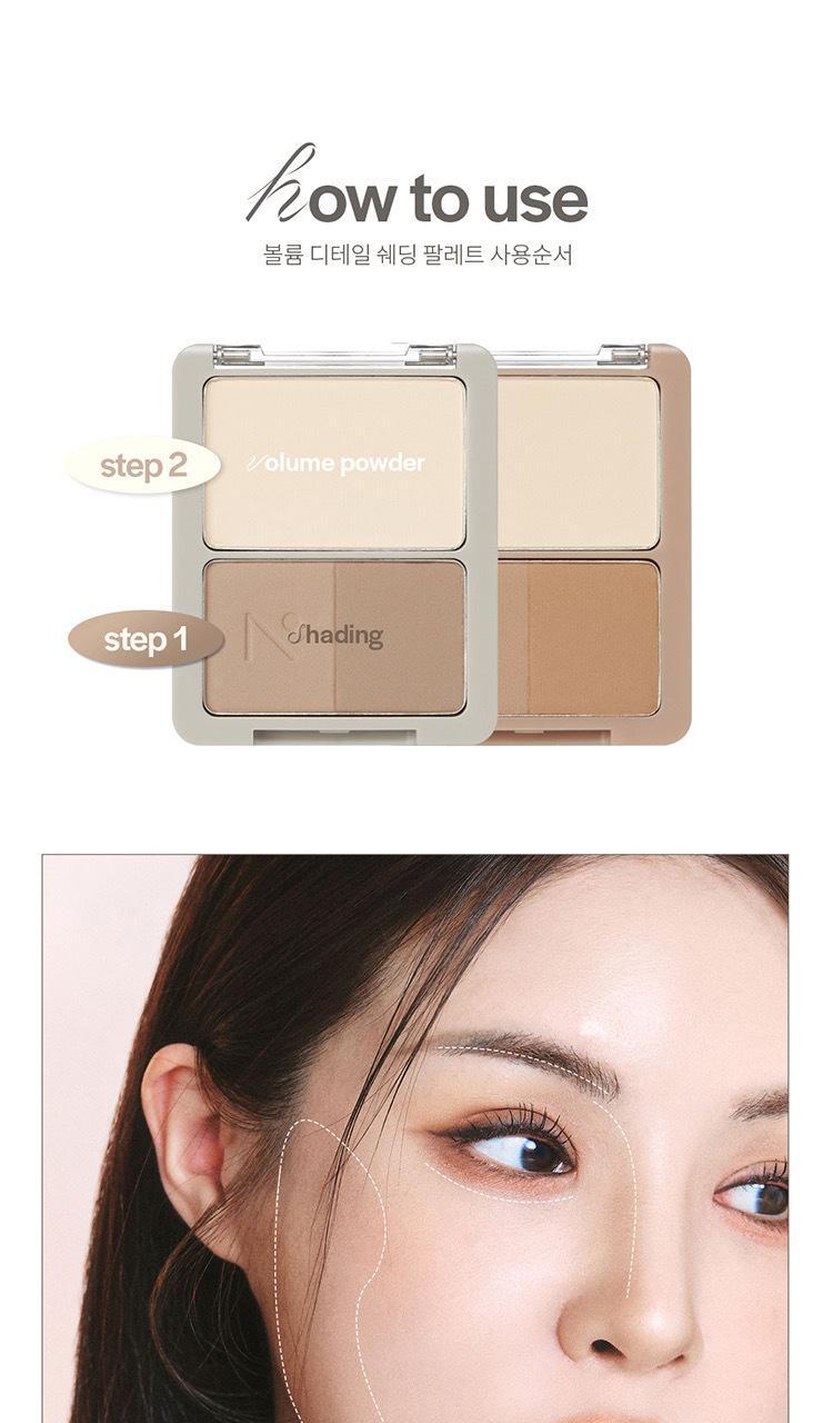 - How to Use: 1. Mix 2 colors from the shading palette, or tap the desired color onto the area you want to shade. 2. Using the Volume Powder in the upper part, lightly dab onto areas where you want to add volume, such as the bridge of the nose, cheeks and tip of the chin.