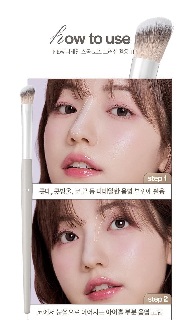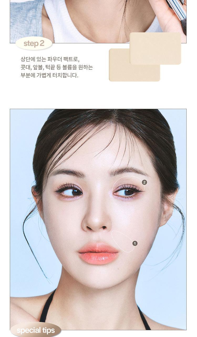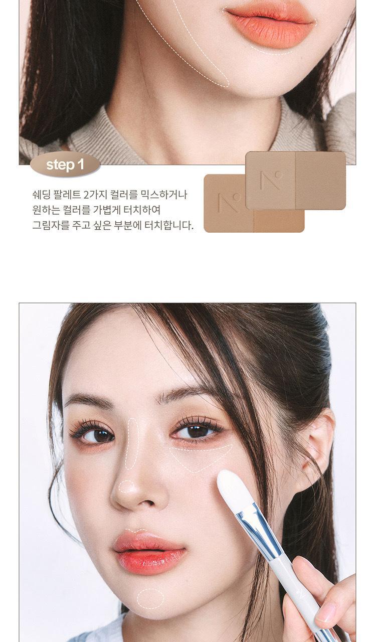 1. Mix the two colors of the shading palette or lightly touch the desired color to the areas where you want to create shadows. 2. Lightly tap the palette ‘s powder on the top to areas where you want to highlight, such as the bridge of the nose, cheeks, and chin.