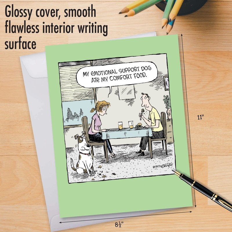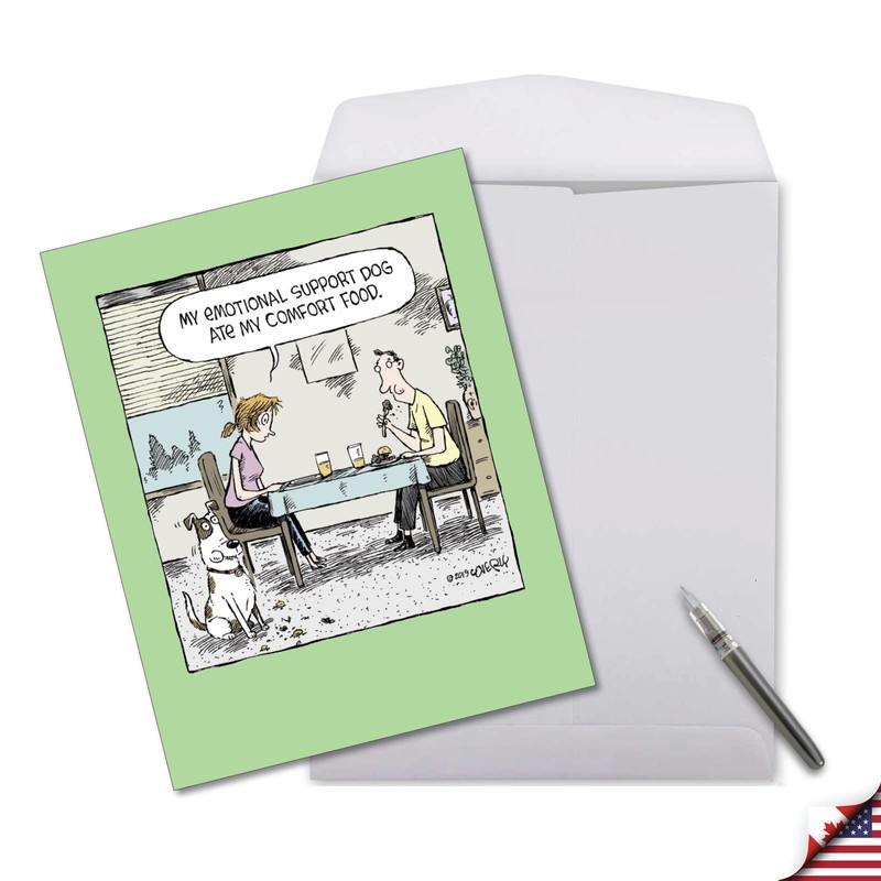 - INSIDE GREETING: "Relax and have a Happy Birthday From All of Us!" COVER - My emotional support dog ate my comfort food.