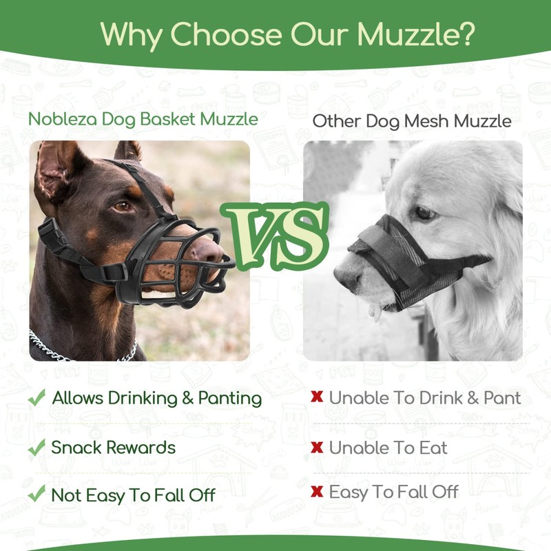 - PROTECTION: Nobleza Dog Training Muzzle has a basket design that gives an all-around cover of the dogs' mouth, in that way the dogs can keep away from chewing dirty foods. Your dog can drink through the muzzle due to the wide holes of the muzzle. This design allows for maximum ventilation to prevent your dog from overheating.