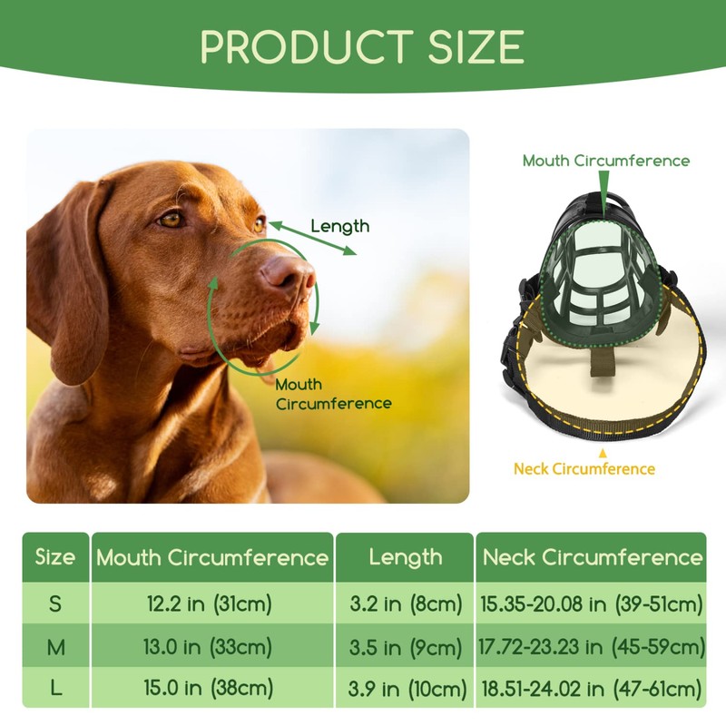 - SIZE GUIDE: Please kindly measure your pet's Mouth Circumference and Neck Circumference before purchasing to determine which size fits your pet. S: Snout Length: 8 cm, 3.15 in; Mouth Circumference: 31 cm, 12.2 in; Neck Circumference: 39-51 cm, 15.35-20.08 in; M: Snout Length: 9 cm, 3.54 in; Mouth Circumference: 33 cm,13.0 in; Neck Circumference: 45-59 cm, 17.72-23.23 in; L: Snout Length: 10 cm, 3.94 in; Mouth Circumference: 38 cm, 15.0 in; Neck Circumference: 47-61 cm, 18.51-24.02 in.