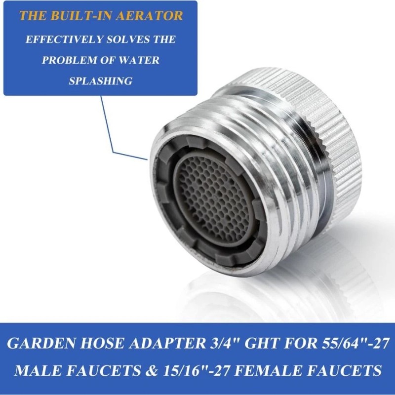 About this item Function - The garden hose adapter is suitable for connecting a standard 3/4-inch garden hose, allowing your faucet to serve two functions: connecting to a garden hose and draining water normally without having to remove and connect the adapter each time. The built-in aerator effectively solves the problem of water splashing when not connected to a garden hose. Fit - Use only on faucets with removable aerators. The adapter kit is available in 55/64"-27 threads for installation on 55/64"-27 male faucets and 55/64"-27 X 15/16"-27 male adapters for 15/16"-27 female faucets. Premium Material - The faucet hose adapter is made of high-quality solid brass with a chrome-plated surface, precise threads, corrosion-resistant, and sturdy. Wide Range of Uses - Can be used in different places, such as garden, kitchen, bathroom, etc. For garden watering, pet bathing, car washing, and more. Easy Installation - Quick and easy installation, no plumber required. A faucet aerator key for removing the original aerator is included, along with a roll of faucet tape for easy and practical installation. Size: 0.93 x 0.75 x 0.75 inches."📏 [Important Notice] Size/Model Verification Policy - Please Read Before Ordering