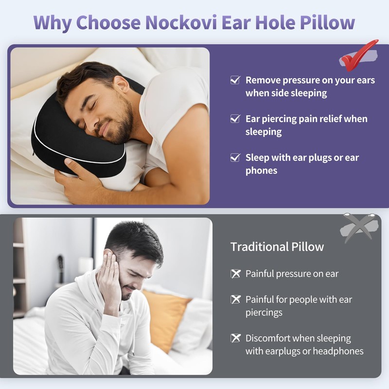 The Nockovi Orthopedic Ear Pillow features innovative hollow-center design that creates a protective space for healing piercings. Whether you're recovering from new ear piercings or experiencing ear discomfort, our 3.5-inch central opening helps minimize pressure points while maintaining proper spinal alignment.